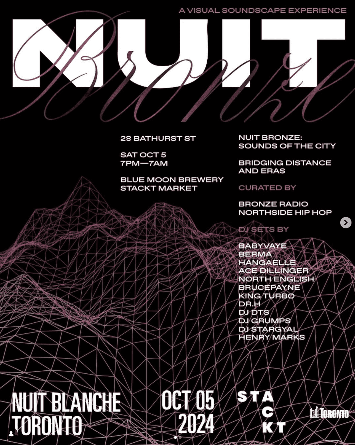 From sunset to sunrise, on October 5, 2024 BRONZE RADIO and Northside Hip Hop brought Toronto’s diverse music culture and pioneering influences from Hip Hop to Stackt Market for Nuit Blanche 2024.